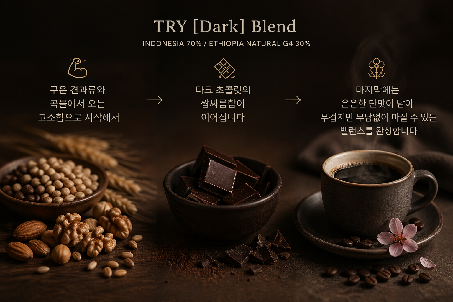 💡 인도네시아를 중심으로 묵직한 바디와 고소한 풍미를 만들고 에티오피아 내추럴을 더해 단맛과 향의 여운이 자연스럽게 이어지도록 설계했습니다